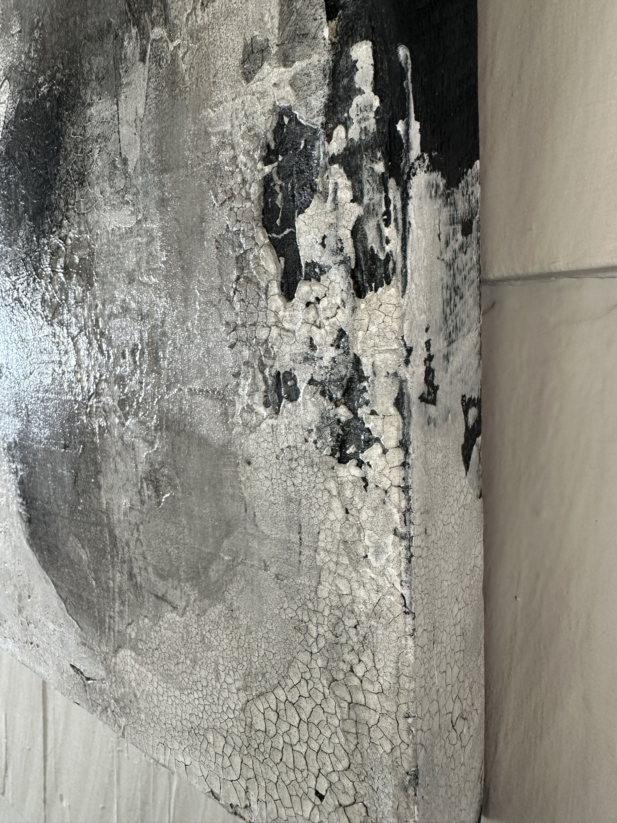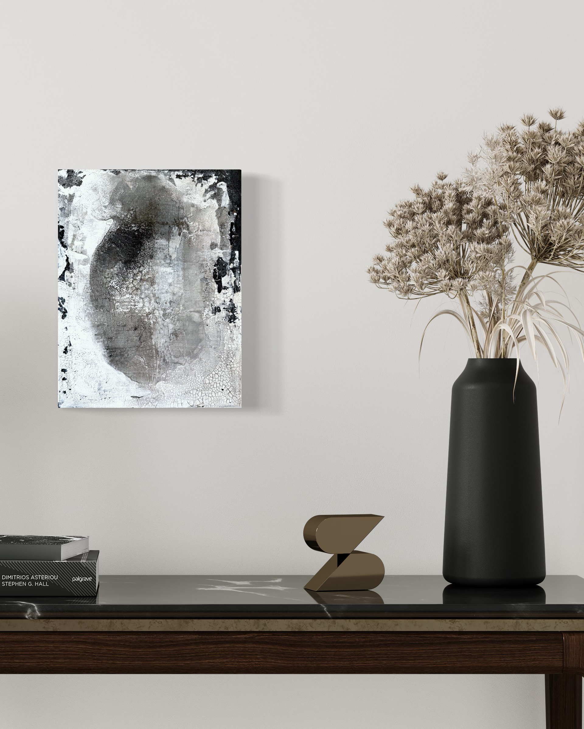 In crafting this piece, I delved into a palette of grays and blacks, using acrylics, ink, and plaster to explore the textures and shadows that govern our inner emotions. The abstract form at the center—simultaneously a void and an echo—invokes contemplation and introspection. Balancing between impressionism and minimalism, this painting stands as a reflection on the complexities of solitude and the human condition. It will bring a profound energy and a thoughtful ambiance to any space it inhabits.