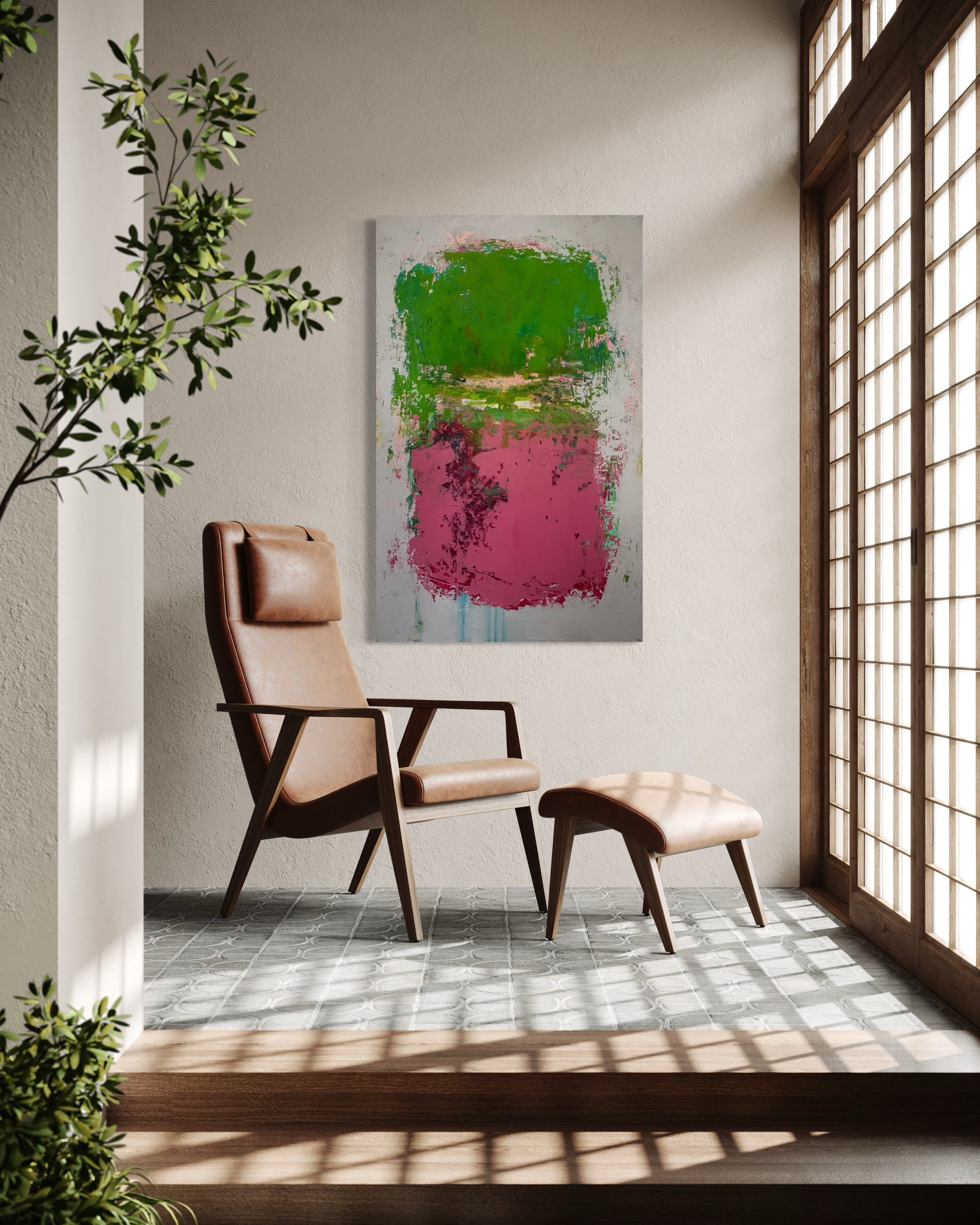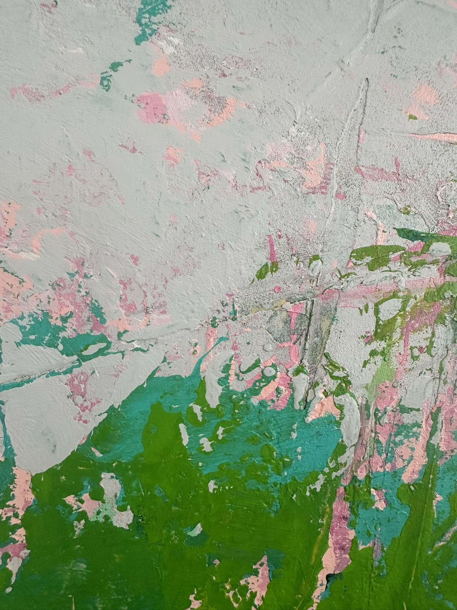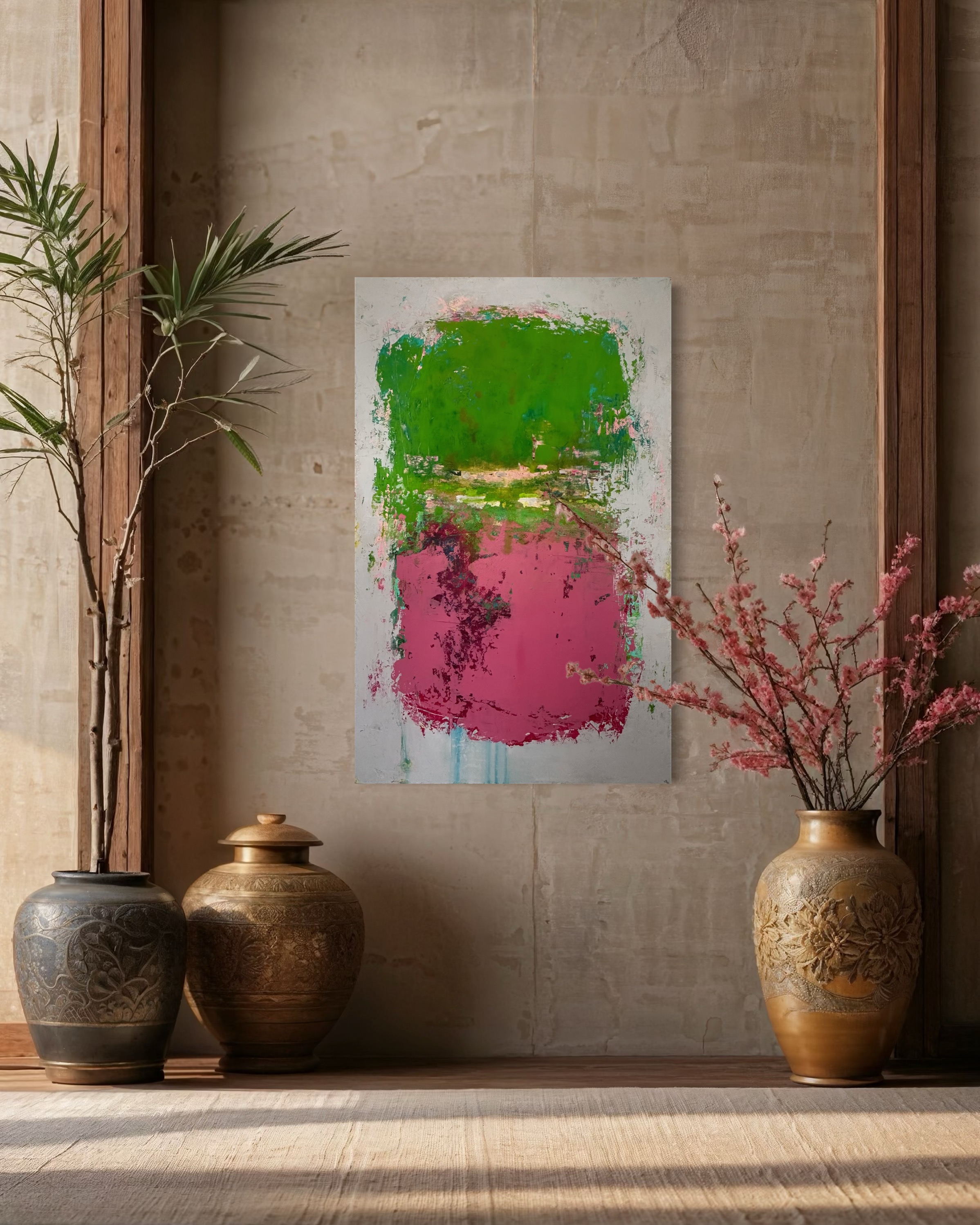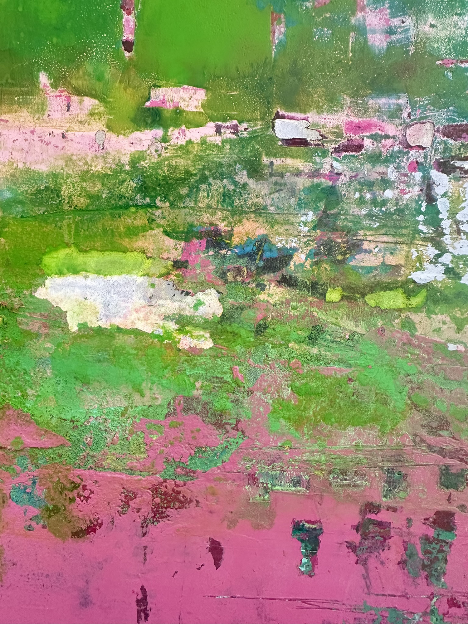 In creating this piece, I channeled my passion for nature’s vibrant, yet often-missed, undercurrents. The vivid chartreuse against the deep salmon represents life’s vivid awakenings against subdued backdrops. Utilizing acrylics, ink, and plaster allowed me to explore texture as a metaphor for life’s layers. This artwork embodies resilience and evokes a sense of renewal. It will add a dynamic and inspiring energy to any space, encouraging reflection and invigoration.