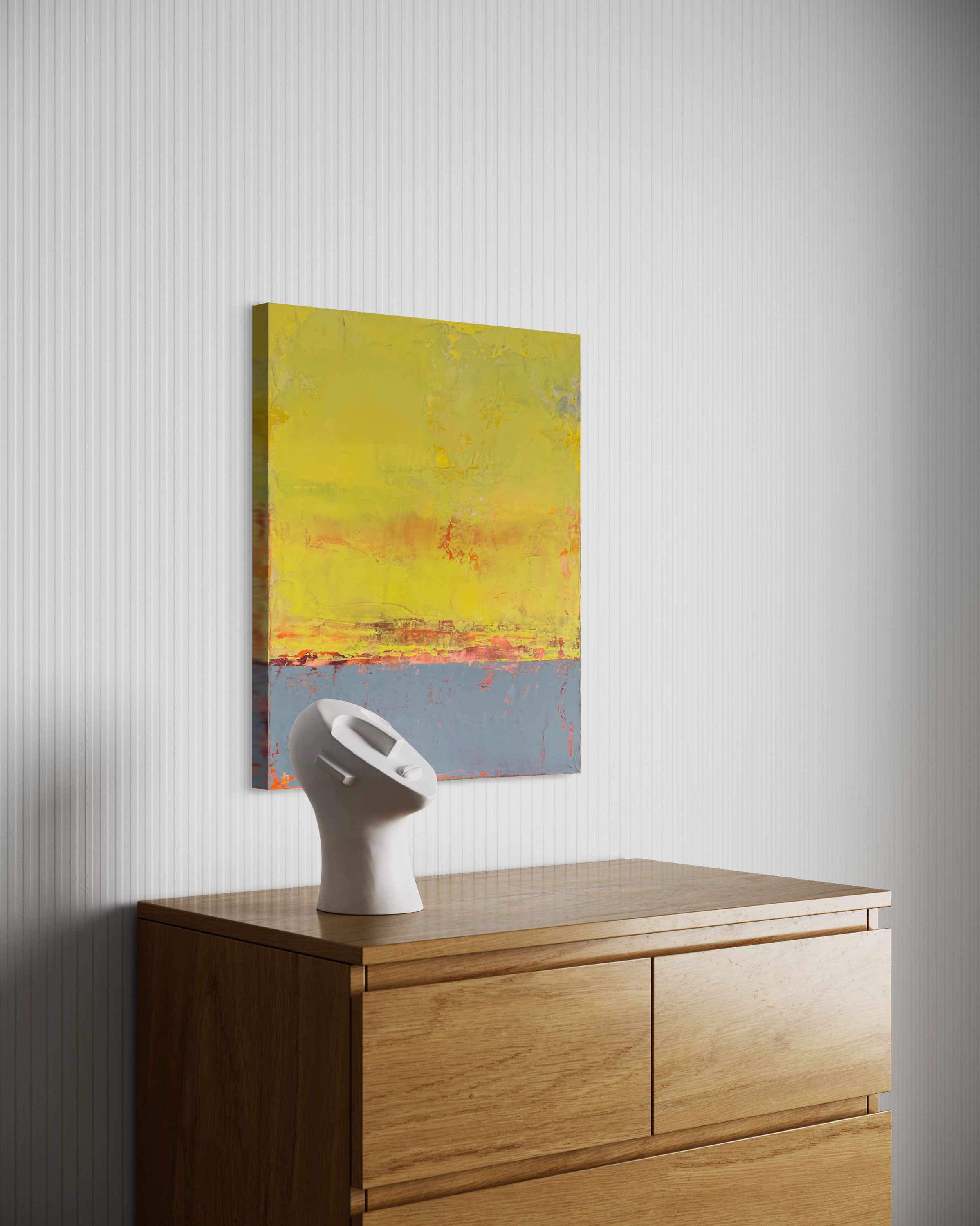 “Lemon Yellow and Blue is created from the style of Color Blocking made popular by Piet Mondrian. “Mondrian valued simplicity and, as a result, experimented with how far he could simplify his work, maximizing simplicity while still maintaining recognizable, although abstract, geometric shapes.”
