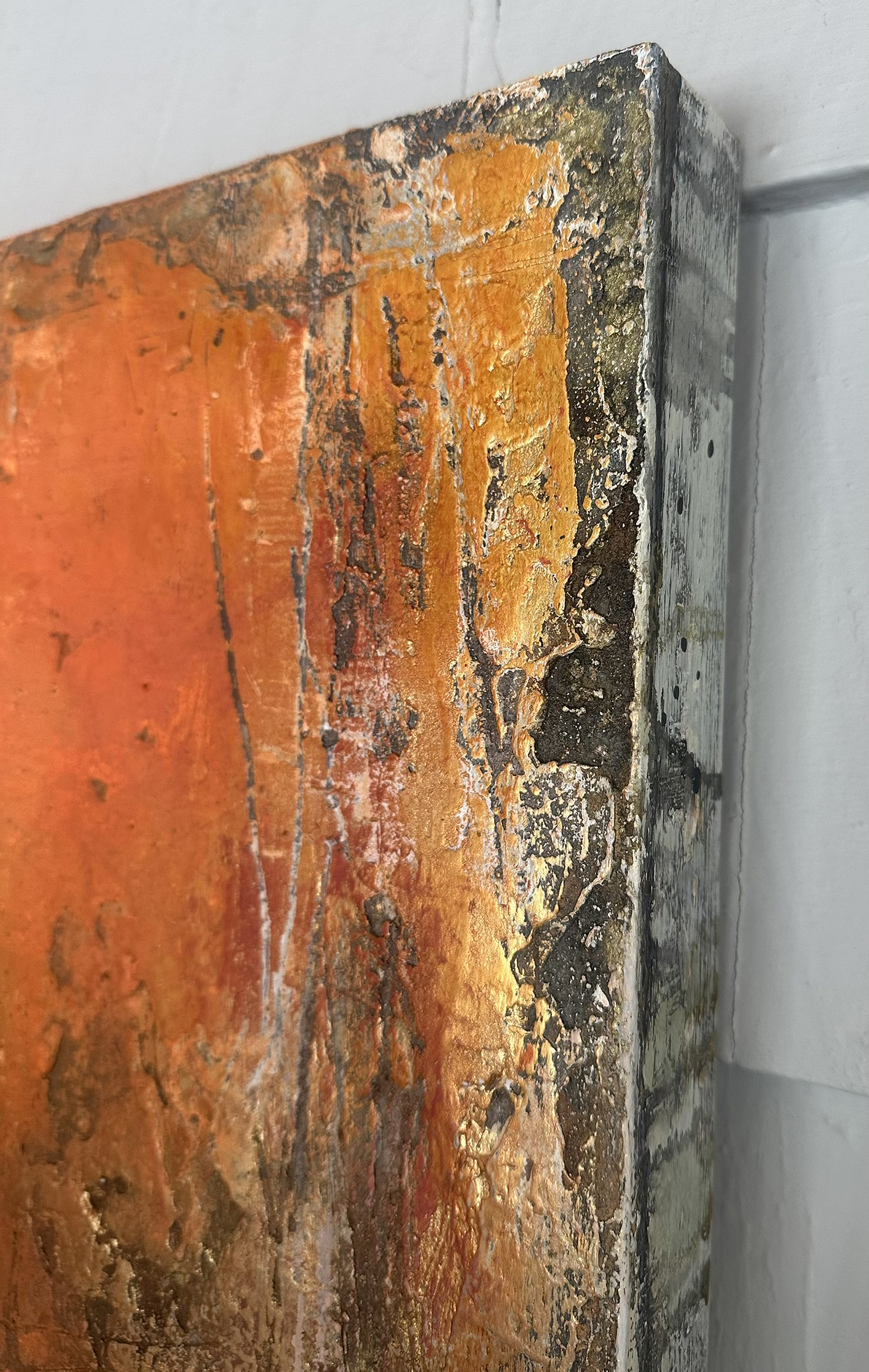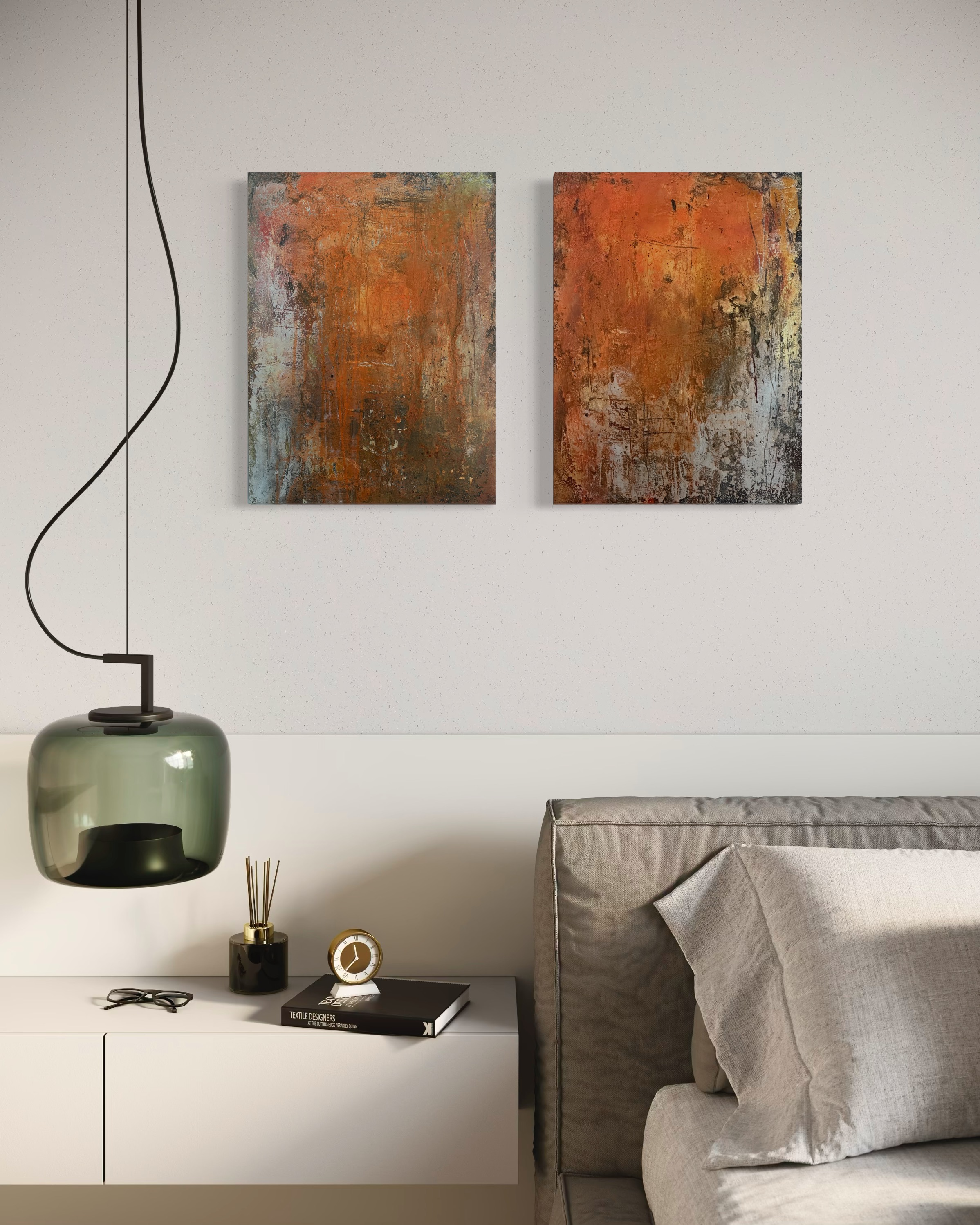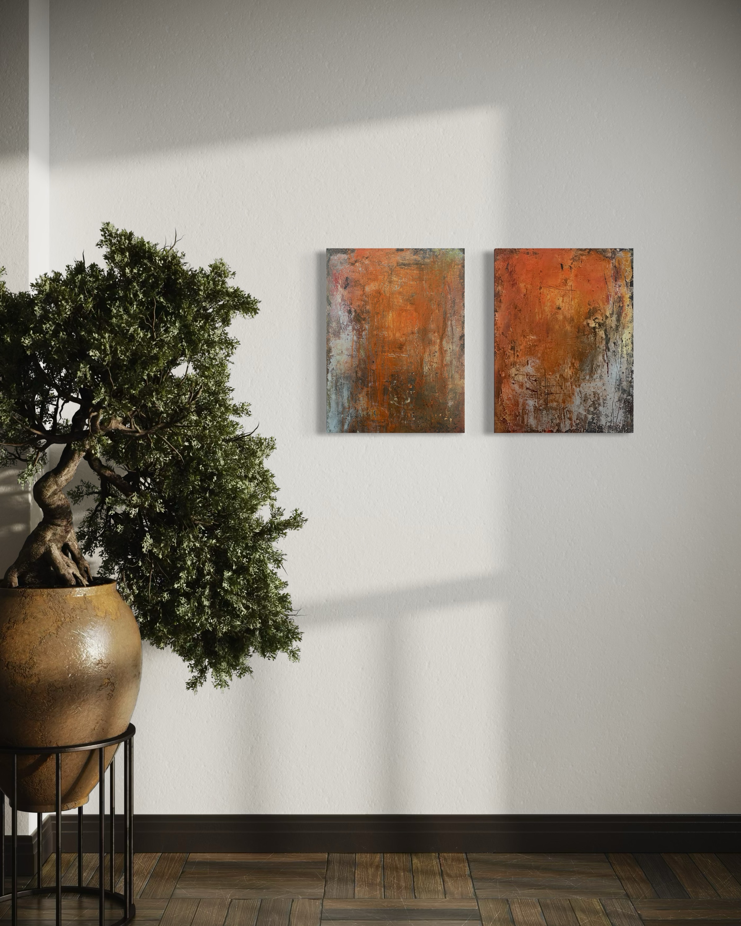 In this diptych, I poured raw emotion into layers of acrylic, graphite, ink, and plaster to evoke transformation. The rough textures and fiery hues embody intensity and resilience, reflecting inner change. This abstract minimalism invites you to feel the energy of growth and unrest, making your space pulse with dynamic warmth and depth. It’s a visual journey of evolution captured in bold simplicity.