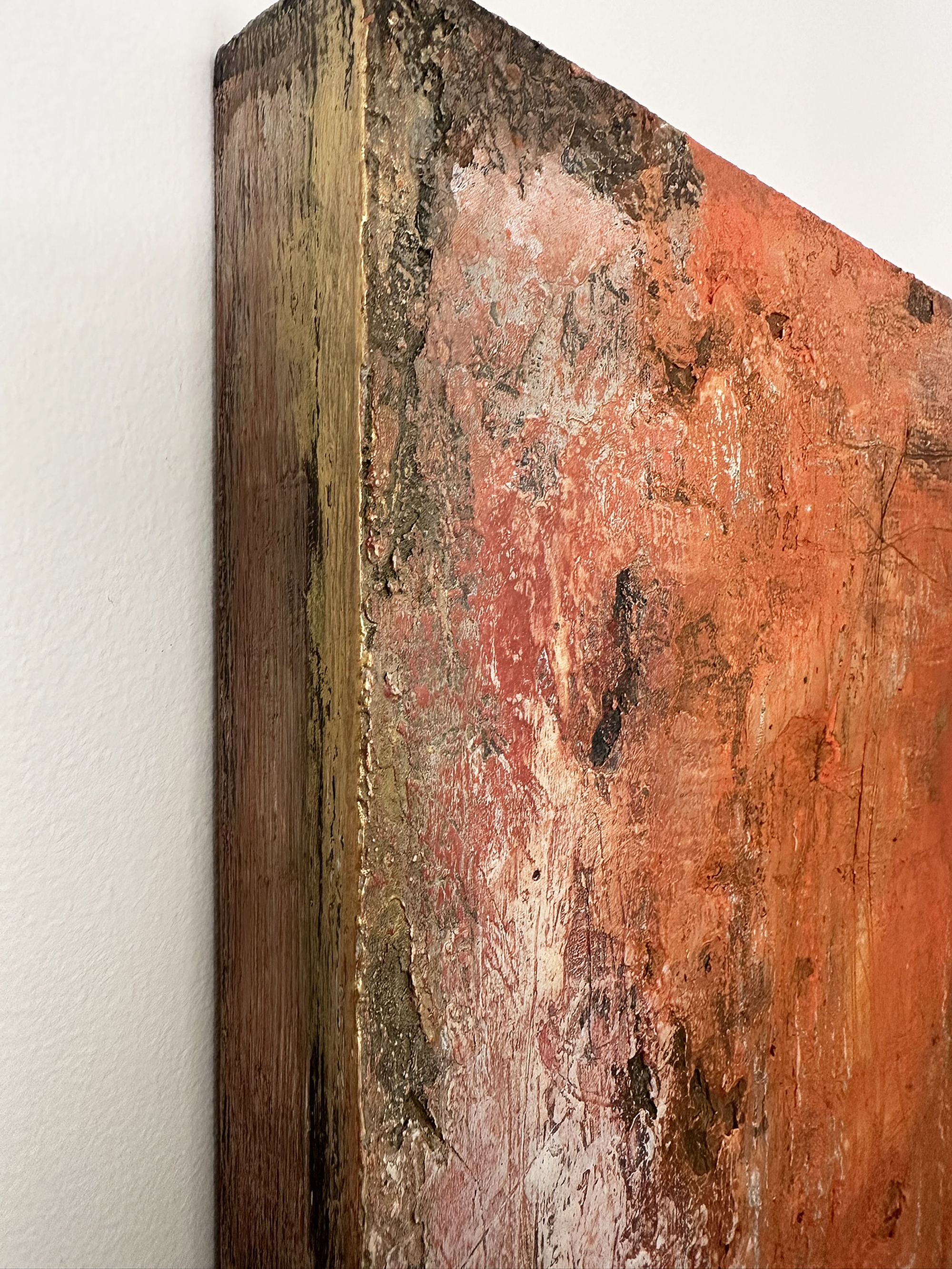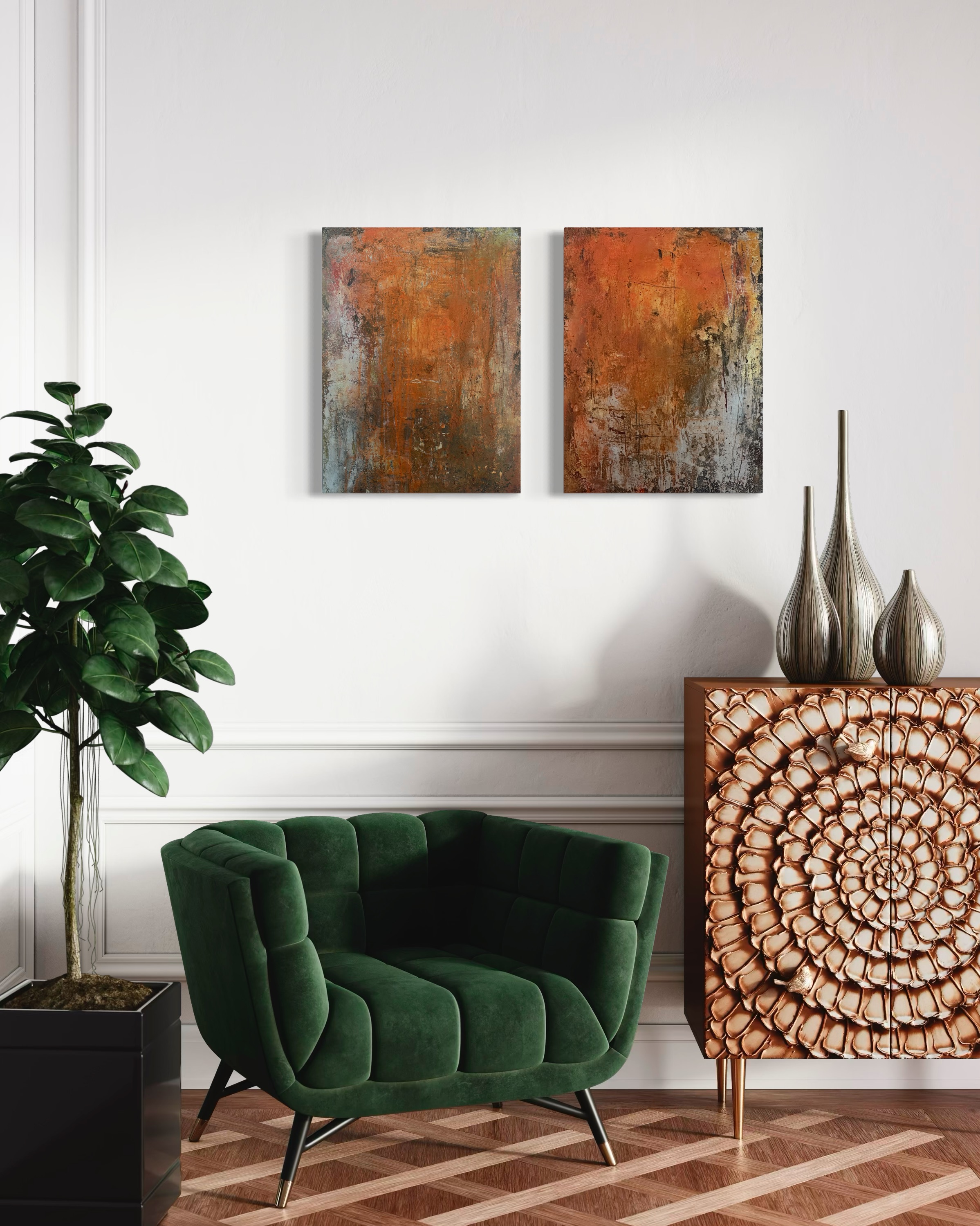 In this diptych, I poured raw emotion into layers of acrylic, graphite, ink, and plaster to evoke transformation. The rough textures and fiery hues embody intensity and resilience, reflecting inner change. This abstract minimalism invites you to feel the energy of growth and unrest, making your space pulse with dynamic warmth and depth. It’s a visual journey of evolution captured in bold simplicity.