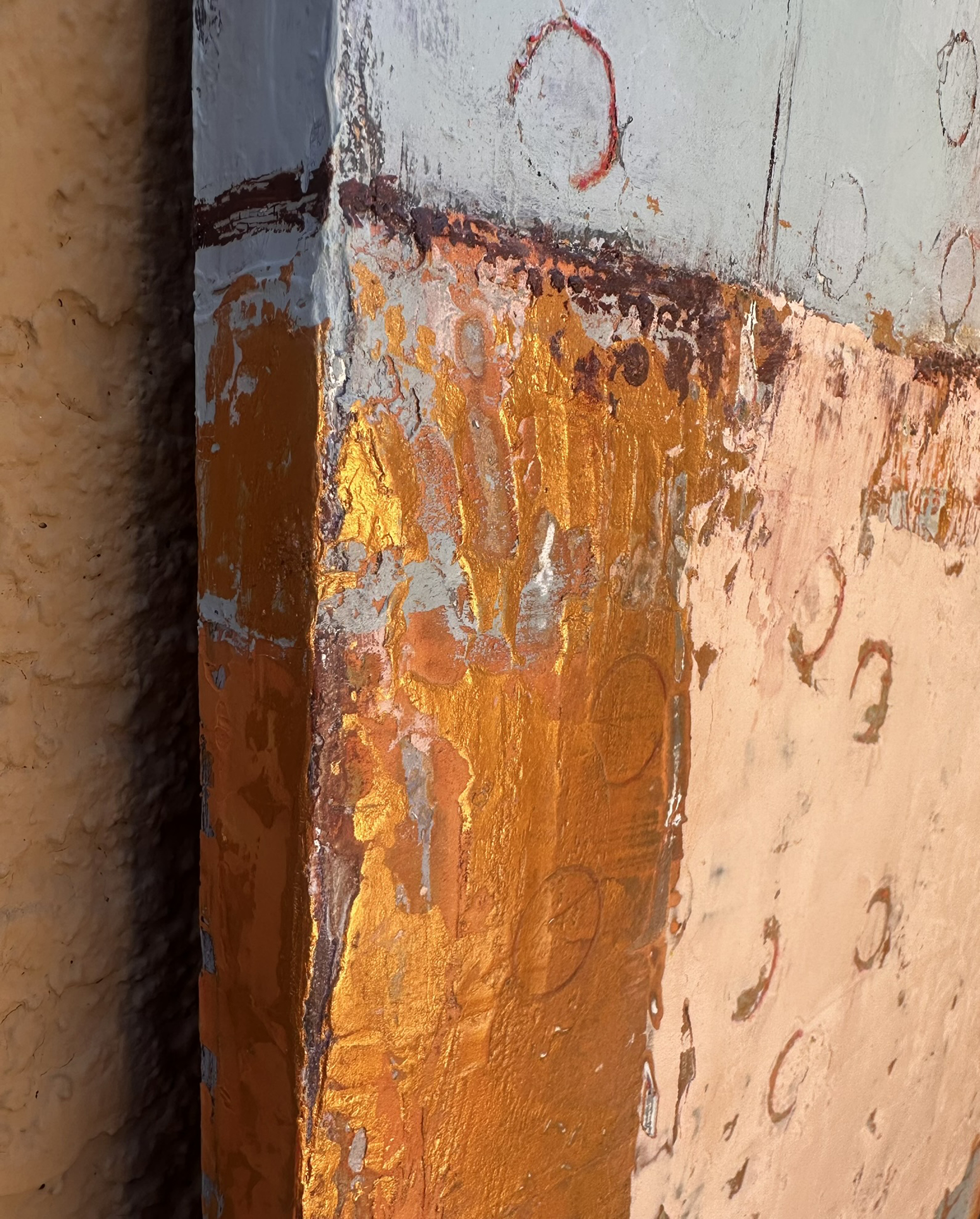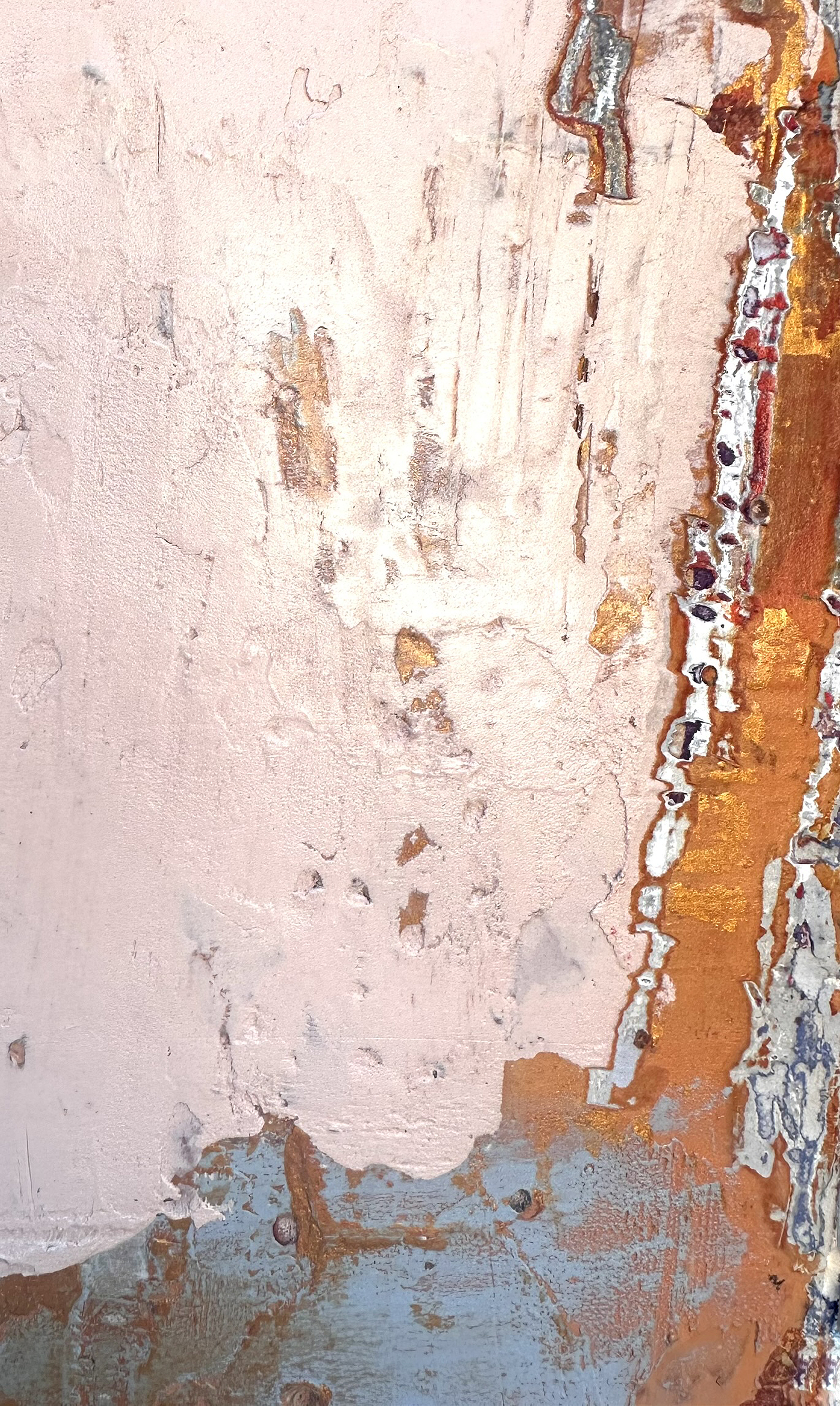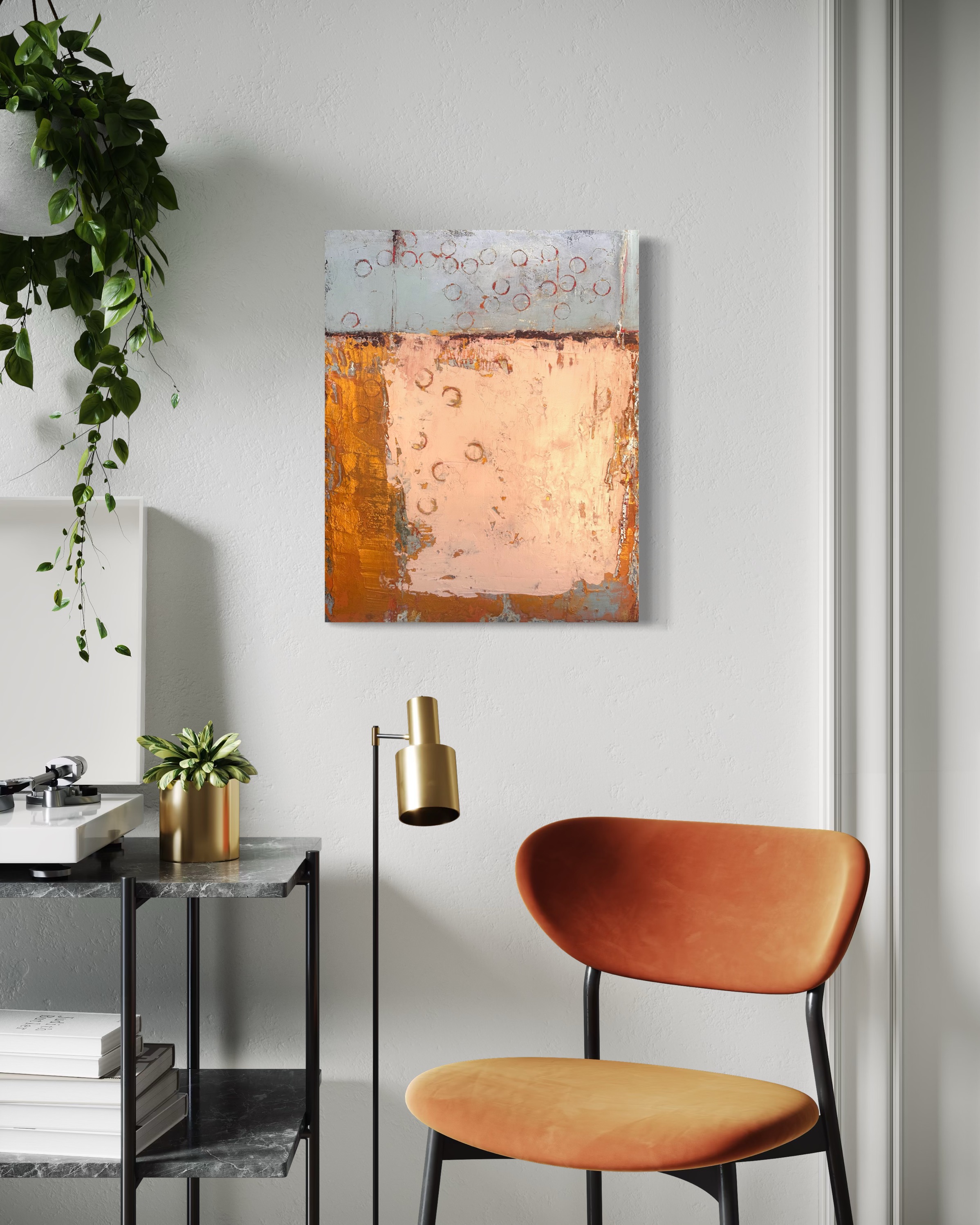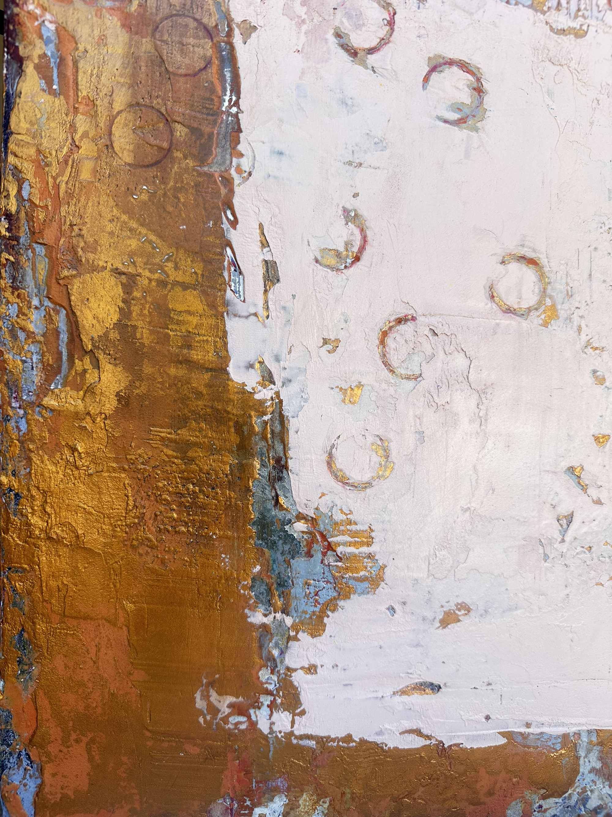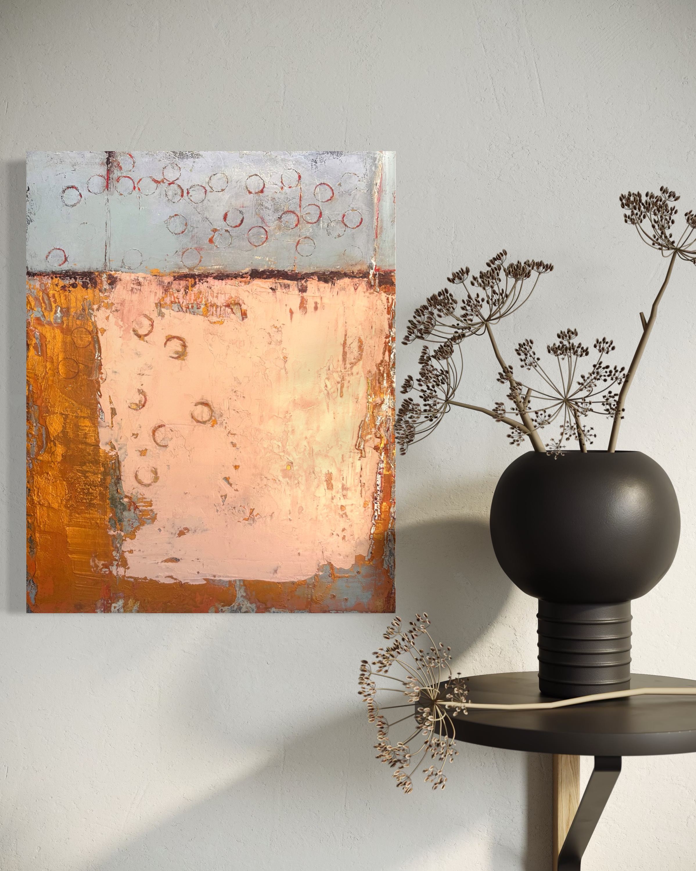The warmth of pink and gold hues creates a sense of calm reflection, while subtle circular patterns introduce a rhythmic energy. This artwork embodies a celebration of balance, contrasting structure with spontaneity. The heavy mark making adds depth and intrigue.