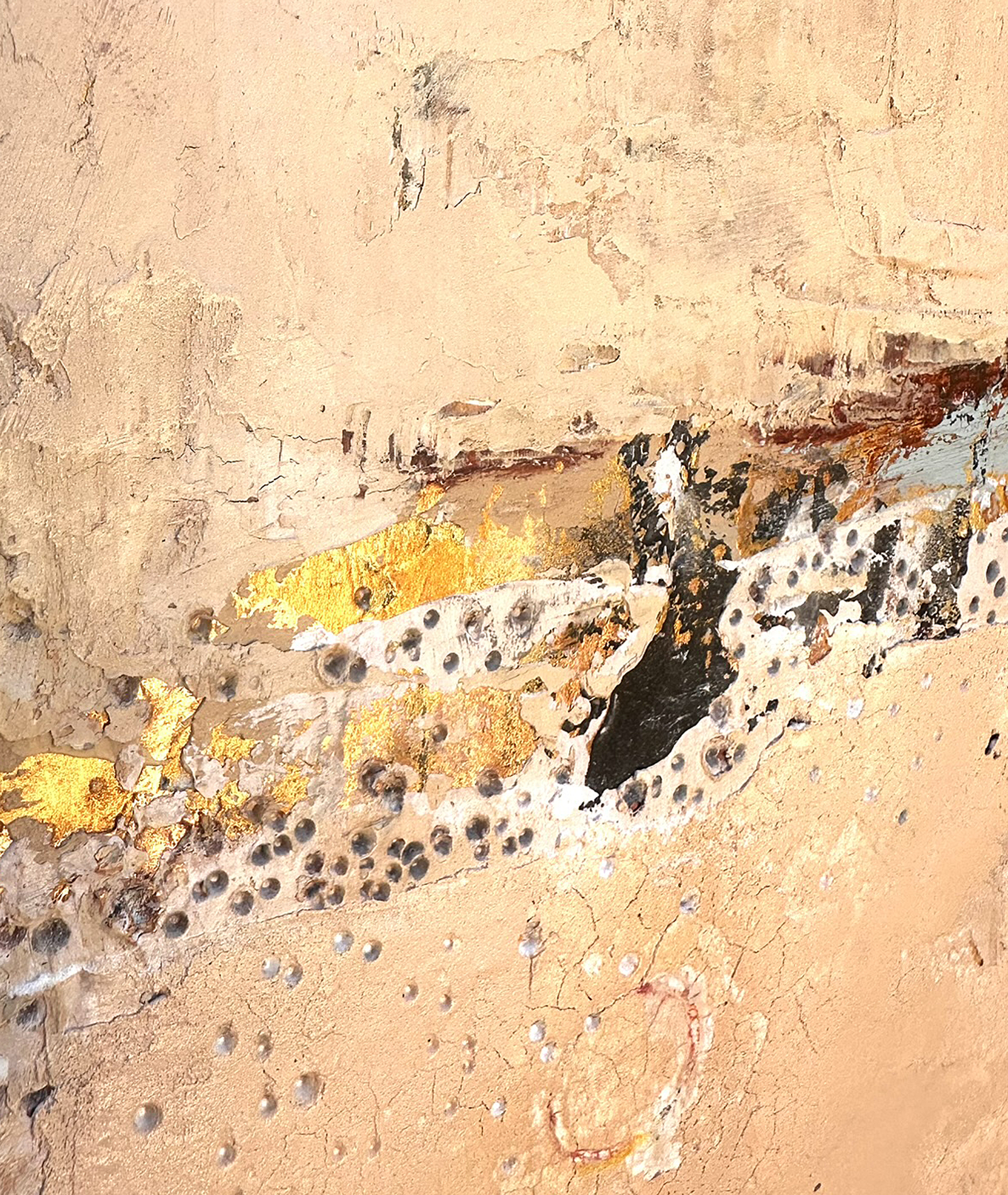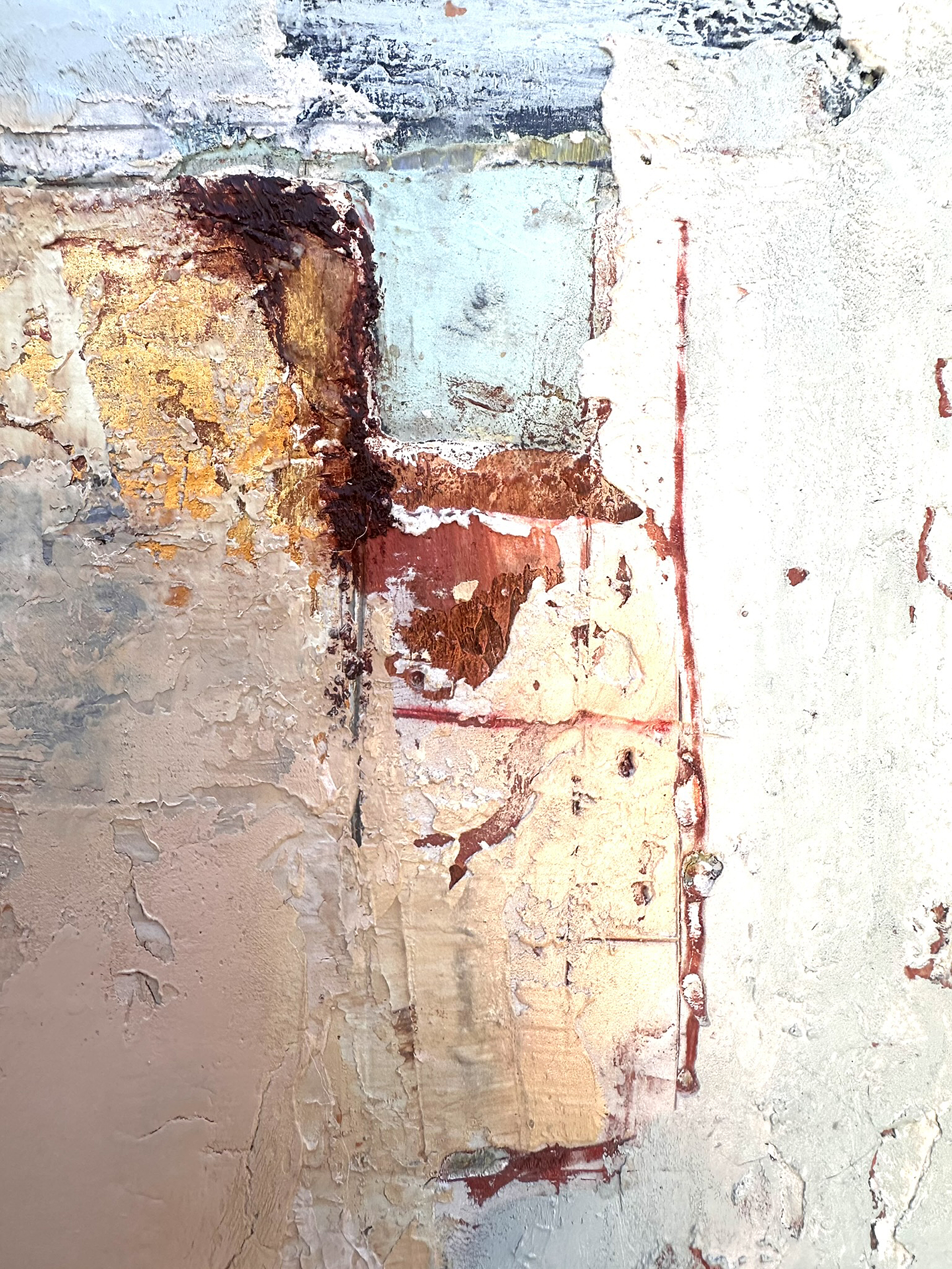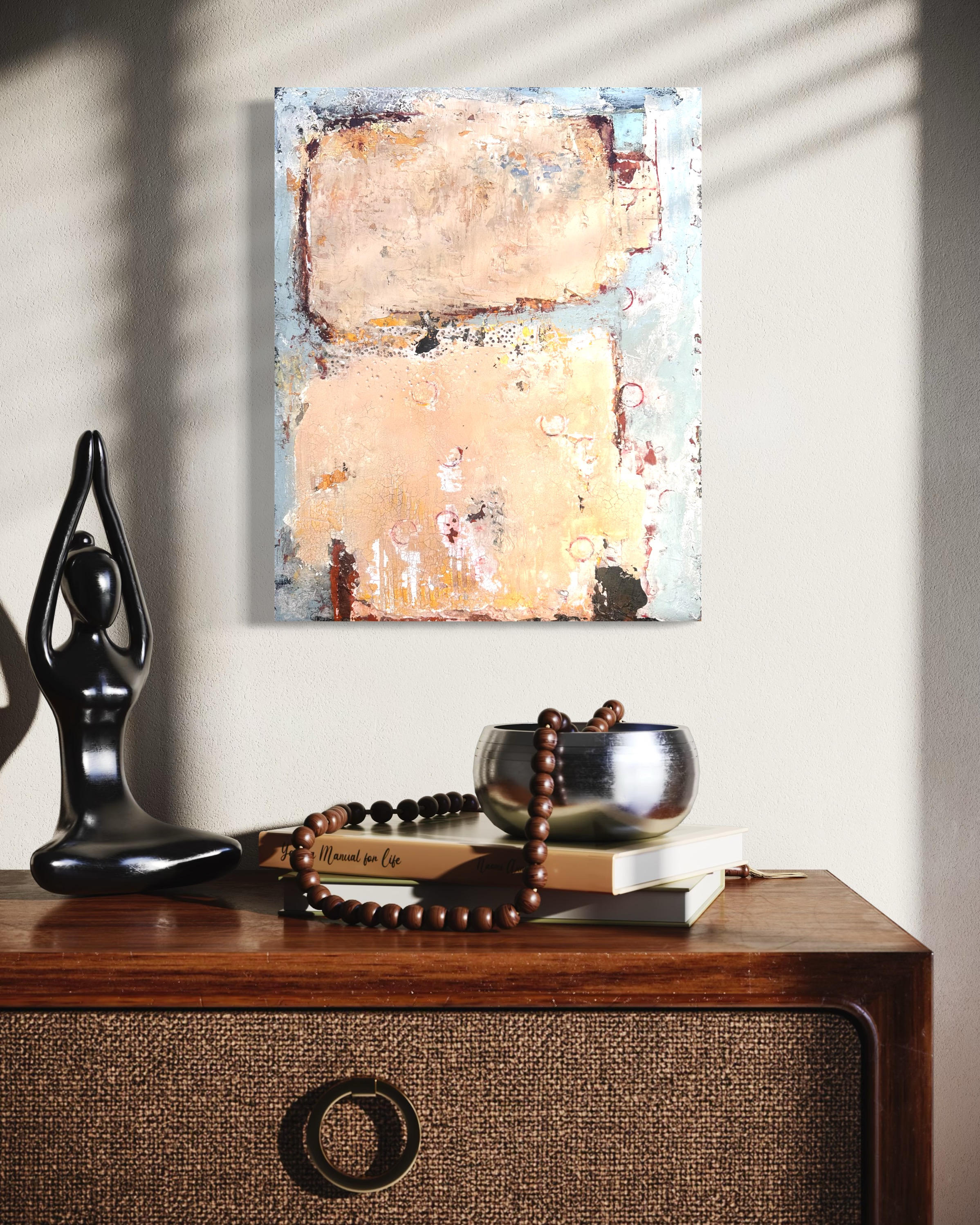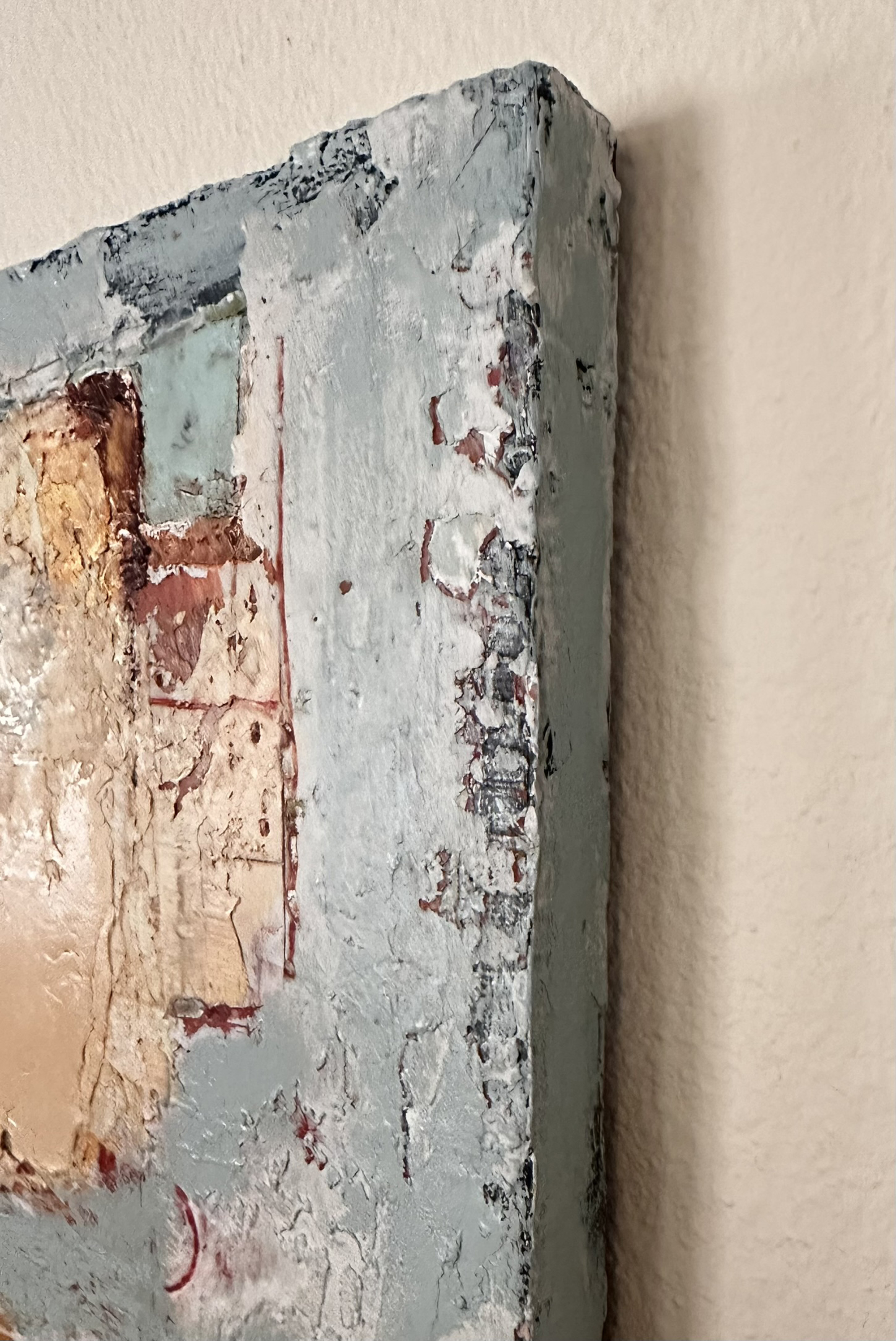 “Vessel of Hope” is a testament to quiet strength, resilience, and beauty, rendered in abstract form. I created this original painting by layering plaster, acrylic, and ink on wood, achieving a highly textured surface with heavy mark making. The interplay of soft, neutral tones and subtle hints of pale pink evoke a sense of calm while simultaneously sparking curiosity.